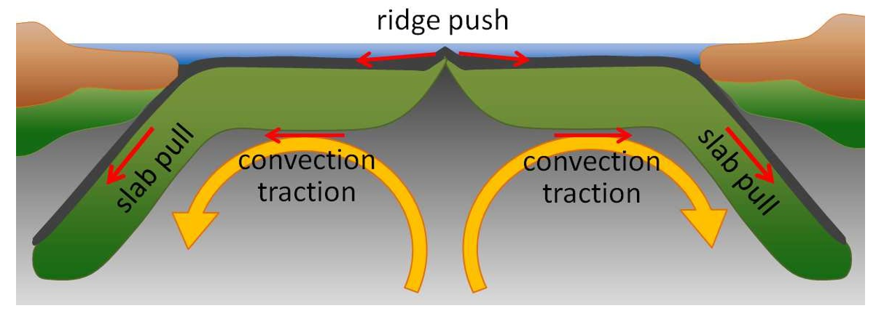 Figure 2: Factors that are responsible for plate movement during plate tectonics, convection and slab pull and ridge push forces [7].