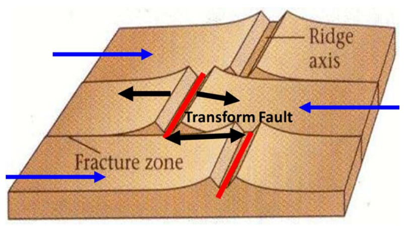 Figure 3: Oceanic ridge fracture zone perpendicular to the ridge axis. Plates slips laterally along each other and is called a transform plate boundary (modified after Marshak 2001) [8].