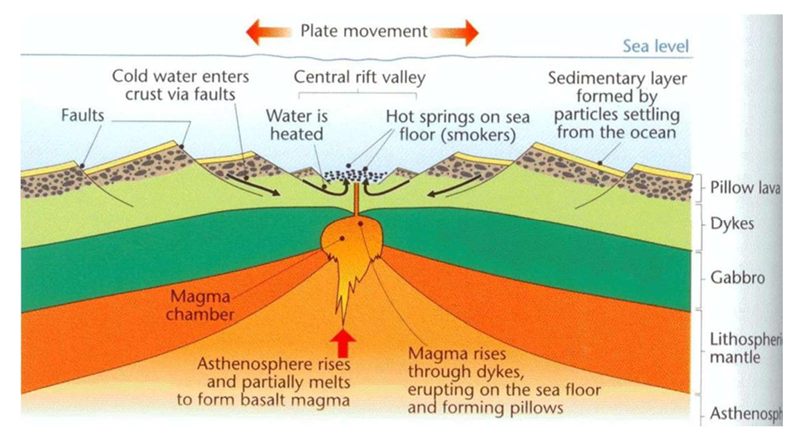 New oceanic crust and upper mantle is formed at the spreading centres of the oceanic ridges (Figure 4). Fresh basaltic lavas can be exposed on the seafloor at ridge crests [8]. These basalts are progressively covered by sediments as the seafloor spreads from the ridge axis. The heatflow at the ridges is many times larger than anywhere in the world. Cold seawater flow into the crust and is heated to form seafloor hot springs and black smokers.