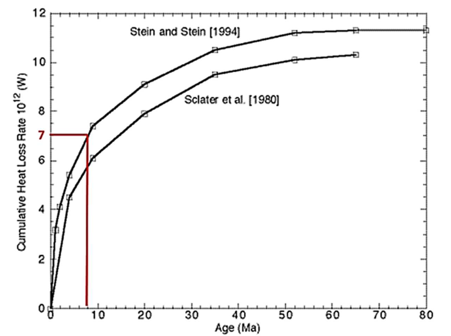 Figure 5: Cumulative heat loss rate for all oceans resulting from hydrothermal convection. The estimated heat loss rate at the young sea floor (< 8 Ma) is indicated in red (modified after Harris and Chapman [13]).