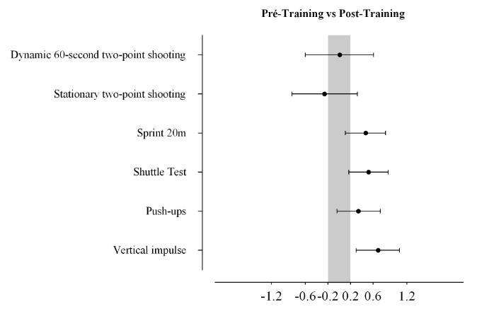 Table 2 and Figure 1 show the effects when comparing the moment of analysis (pretraining vs post-training) between the control and experimental groups. Comparing the pre- and post-training, the positive effect of the training program on four of the six variables analyzed (i.e., 20m sprint, shuttle test, push-ups, and vertical impulse) showed a possible increase in the push-ups (difference in the averages = 3.0 ± 3.4; 90% confidence limit), a likely increase in the 20 m sprint and shuttle test (0.13 ± 0.10; 6.8 ± 4.5, respectively), and a very likely increase (3.8 ± 2.1) in the vertical impulse, with a small effect on any of the variables mentioned. Comparing the pre- and post-training moments concerning the performance of the variables during dynamic 60-second twopoint shooting and stationary two-point shooting tests, the results appeared to be similar, presenting an unclear effect (0.01 ± 0.62; -0.3 ± 0.7, respectively).